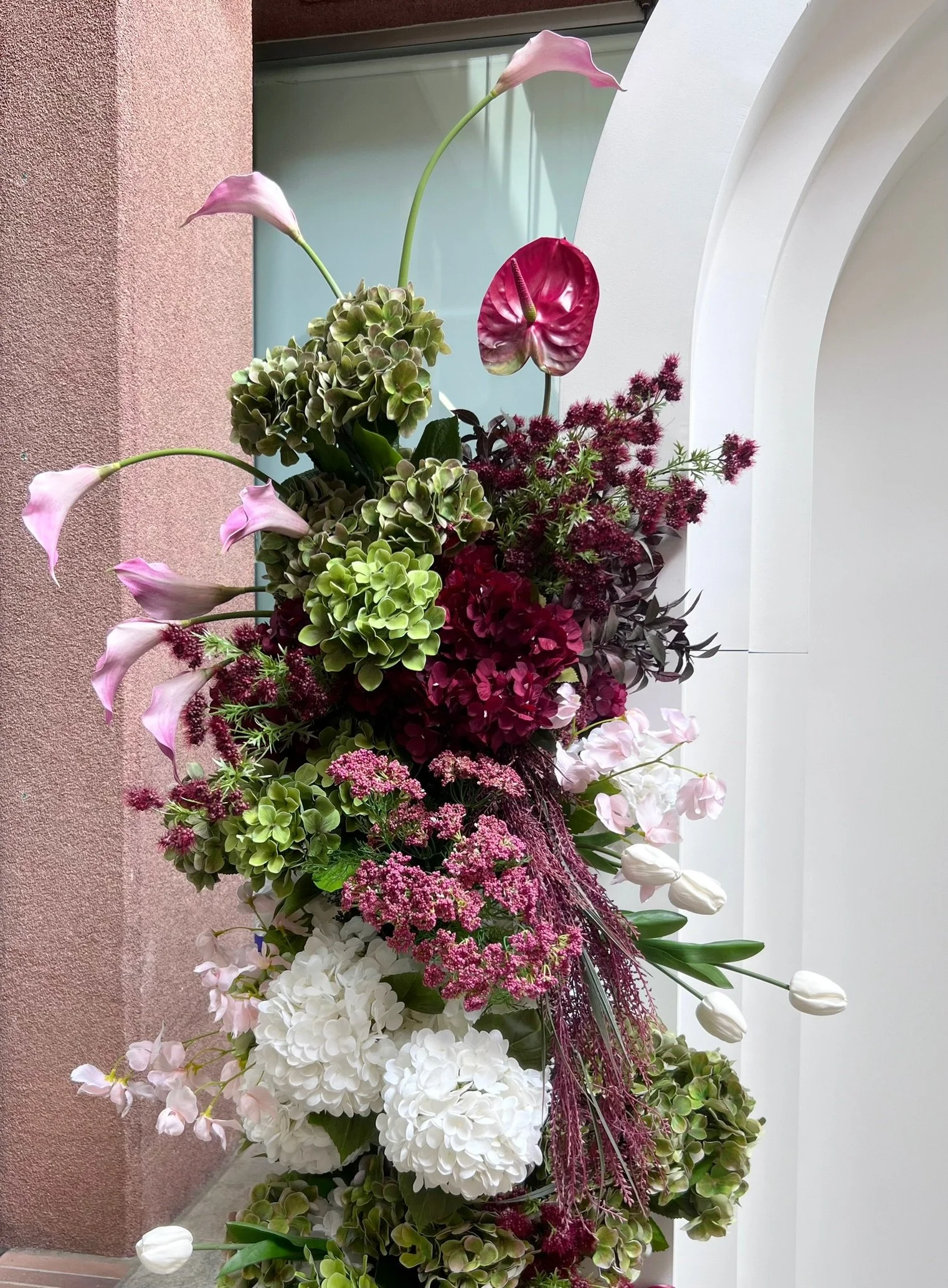 Our clients will usually select custom designed faux florals for plinths, welcome signs, table centrepieces, gift table, bar and cake table that we set up and then collect after your event.